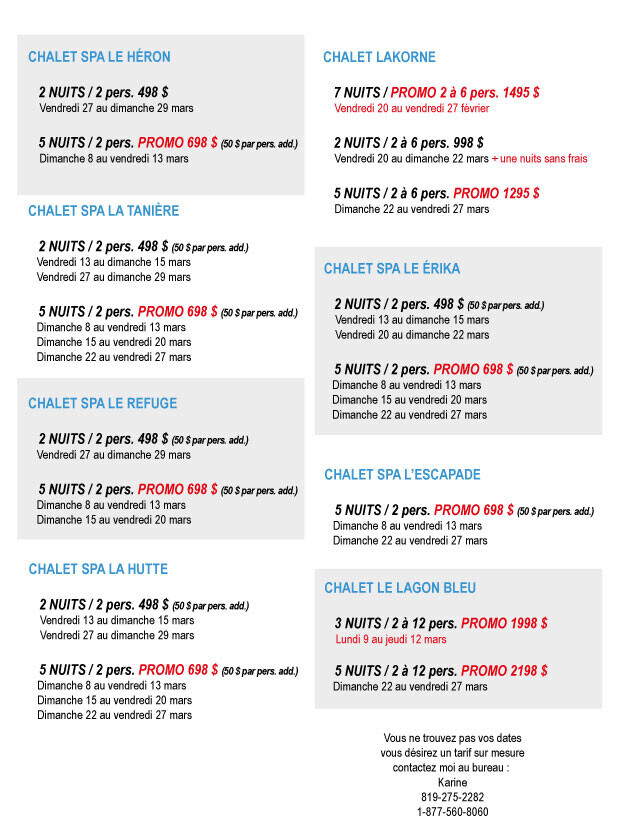 Tarif en fonction du nombres de pers. 2 à 8, à partir de 498 $ + tx pour 2 pers.